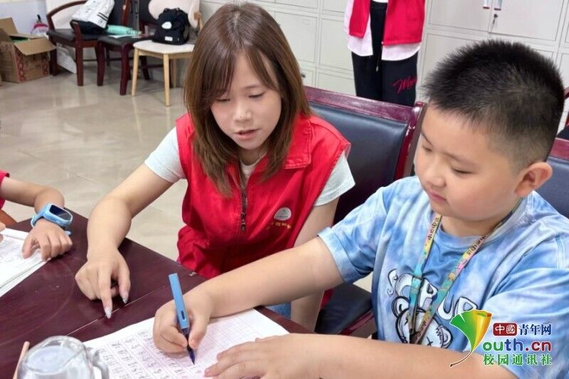 图为志愿者给小朋友辅导作业。黄静雯 供图