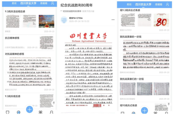 自9月21日起,青年学生们踊跃投入纪念抗战胜利主题征文活动。在“回看9.3阅兵视频,撰写观后感”板块,同学们聚焦阅兵仪式的恢弘场面、军人英姿与先进装备,抒发对强国强军的自豪与对和平的珍视,字里行间洋溢着对国防力量的敬畏;在“向抗日战争英雄书写跨越时空的信”板块,大家以真挚笔触致信杨靖宇、赵一曼等英雄,表达崇高敬意,讲述时代变迁,在跨越时空的对话中深化对英雄精神的体悟;而在“深切感悟抗战精神”板块,同学们结合史实与自身理解,多角度阐释抗战精神的时代价值与传承意义。同时,学院在易班平台设立的“纪念抗战胜利80周年”专栏也同步开展,吸引众多学子积极上传作品,集中展现了新时代青年的历史情怀与责任担当。